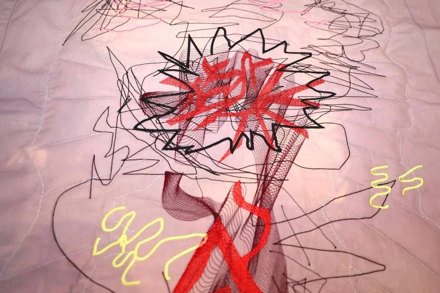 In Scar (Sleepscape), Coldrey translates a drawing first made during a period of chronic pain into an embroidered work on linen. The piece originates from Radiant Pain (2022), one of her sketches documenting her experience of endometriosis. Years later, Coldrey has now re-stitched the design onto a linen pillowcase - an object she slept on for a year while focusing on recovery. The faint stains at its centre are traces of that time, embedding the act of rest within the fabric itself.